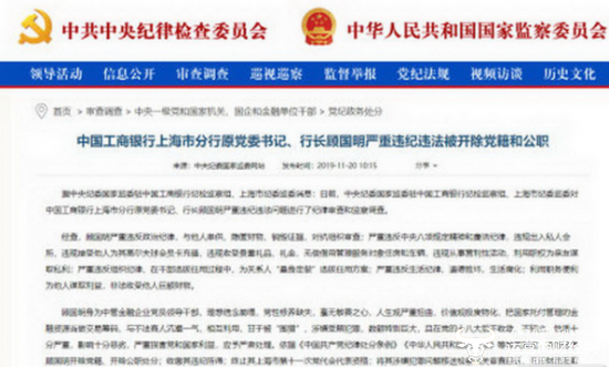 近日,中央纪委据中央纪委国家监委驻中国工商银行纪检监察组、上海市纪委监委消息:日前,中央纪委国家监委驻中国工商银行纪检监察组、上海市纪委监委对中国工商银行上海市分行原党委书记、行长顾国明严重违纪违法问题进行了纪律审查和监察调查。