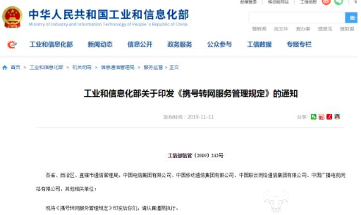 据运营商财经网消息,此前,工信部于11月11日已印发《携号转网服务管理规定》,规定自2019年12月1日起施行。