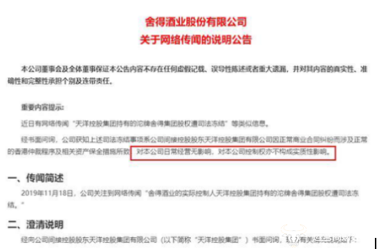 近日,舍得酒业股份有限公司针对网络传闻发布了一则公告,表示近日网络传闻“天洋控股集团持有的沱牌舍得集团股权遭司法冻结”为不实信息。目前天洋控股集团仍持有四川沱牌舍得集团有限公司70%股权等资产,本公司的日常经营也并未受影响。