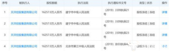 据数据显示,天洋控股集团最近的一次质押行为是2019年6月27日,质权人依然是建设银行廊坊分行,出质股权数额为1.63亿元。