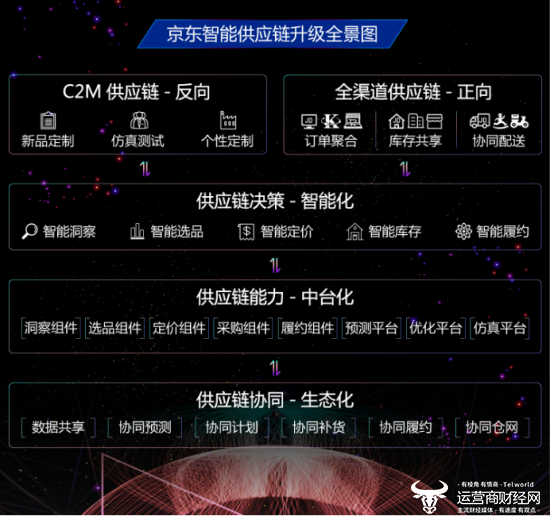 智能供应链中台:全渠道供应链支撑的物竞天择项目目前实现最快15分钟送货上门的体验,未来将实现每年千亿级的交易额。京东C2M反向供应链则能打造出最适合用户需求的产品,跟传统方式相比,将产品需求调研时间减少了75%,新品上市周期缩短了67%。
