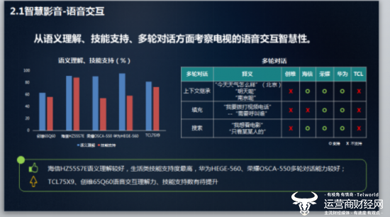 总的来说,作为智慧终端“新物种”之一,智慧屏有一定的突破和提升。报告指出,智慧屏较传统电视屏显、声响效果有所升级,但各产品色彩对比度、杂音抑制表现不一;智慧影音交互基本成熟,但语义理解技能尚有提升空间;智慧生活业务应用丰富,但性能有待优化。具体产品选择上,华为HEGE-560、荣耀OSCA-550综合能力强,而TCL75X9支持8K屏显、画质能力突出,海信HZ55S7E的智慧生活技能则略胜一筹,消费者可以根据诉求进行选择。