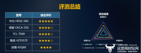 11月15日,《中国移动2019年智能硬件质量报告(第二期)》(以下简称“报告”)正式发布,报告不仅涵盖4G、5G手机的综合能力评测,还包括智慧屏、智能组网终端等评测。其中智慧屏评测部分选取了荣耀OSCA-550、海信HZ557E、华为HEGE-560、创维65Q60 和TCL75X9共计5款智慧屏,既有老牌电视厂家的革新之作,也有跨界终端大厂的创新成果,为消费者提供一份客观、全面的智慧屏指南。
