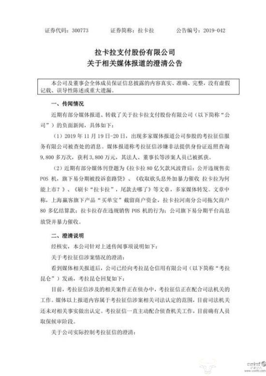 11月21日,拉卡拉发布了一篇5页的公告:《拉卡拉支付股份有限公司关于相关媒体报道的澄清公告》。