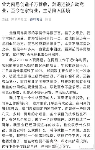 文章作者称,自己2011年入职网易,在网易工作了近8年时间,是一名技术人员,离职前主导的从0到1做起来的项目,年营收达到千万,并且年增长率超过了100%。因跟主管会议上的一次争吵,被说成是顶撞上级而被劝退,不给补偿不说,还被启动竞业,而且竞业范围非常宽泛,只要跟网易有业务重叠的公司都在竞业范围内,导致至今不能求职。