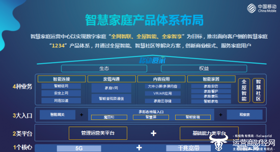 近日,运营商财经网获悉,中国移动以双千兆+智能云网为核心,推出一二三四智慧家庭产品体系。