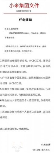 11月29日,小米发布内部全员信公布最新高管任命,其中林斌、王翔、何勇得到晋升;周受资、卢伟冰分别去重要业务线轮岗,黎万强、祁燕因个人原因离开小米。