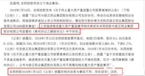 经过证监会调查才发现,吉药控股“继续推进收购”的表述与事实不符,公司存在误导性陈述。最终,吉药控股因信披违规被证监局处以责令改正的警告措施,并处以60万元罚款。