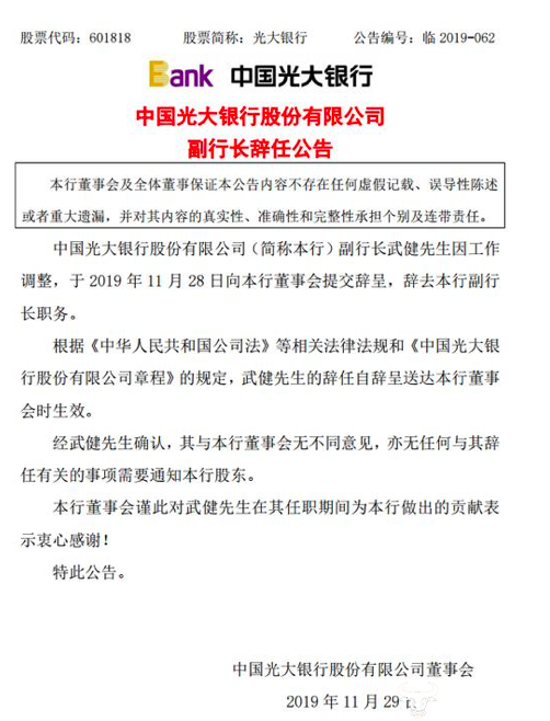 11月29日消息,光大银行发布公告称,副行长武健因工作调整,于2019年11月28日向光大银行董事会提交辞呈,辞去副行长职务。