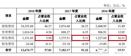 根据公司的数据显示,公司2016年的研发费用为1227万,占营业收入的比重为16.31%,而到了2018年公司的研发费用仅仅增长了104万至1331万,而随着营收的大幅成长研发费用率则从2016年的16.31降至了2018年的5.99%。