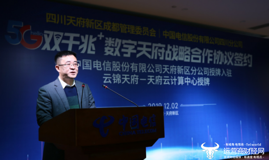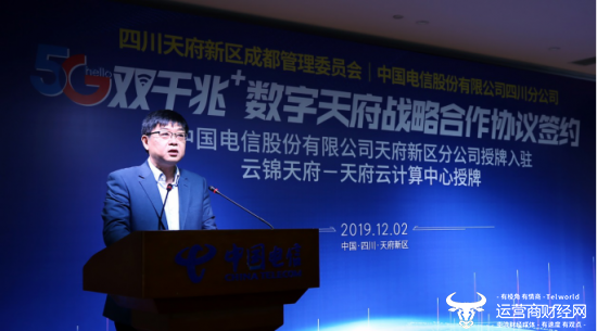 2019年12月2日,天府新区成都管委会与中国电信四川公司《建设数字经济产业生态圈的战略合作协议》签约暨中国电信天府新区分公司、天府云计算中心授牌仪式在天府新区中国电信云计算中心举行。四川天府新区成都党工委副书记、成都科学城管委会主任邱旭东,四川天府新区成都党工委委员、管委会副主任林强,中国电信四川公司总经理郑成渝,副总经理周清久,中国电信成都分公司总经理喻云华,中国电信天府新区分公司总经理汤骏,以及四川天府新区相关单位负责人,中国电信四川公司、成都分公司、天府新区分公司相关人员,媒体记者共同见证了签约仪式。