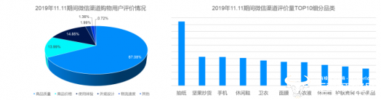 另从2019年11.11期间微信渠道购物用户的评价关键词类型分布来看,商品质量、使用体验、商品价格成为消费者最关心的内容,其中商品质量相关关键词的评价量占比达到67.08%,从评价量细分品类来看,抽纸、坚果炒货、手机等与生活息息相关的商品位居前茅。