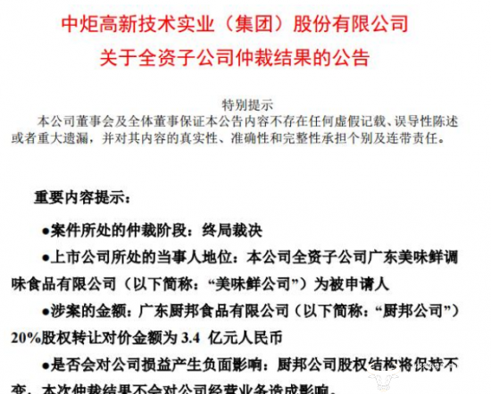 近日,就全资子公司美味鲜收购朗天慧德公司持有的广东厨邦20%股权争议案,中炬高新公告披露了中国国际经济贸易仲裁委员会的终局仲裁。