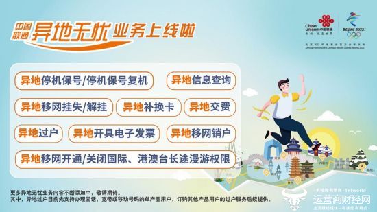 中国联通依托特有的全国集中系统优势,针对外出务工人员、学生、候鸟族、差旅族等流动频繁的人口群体对跨域服务的需求痛点,推出全国一体化的跨域服务及跨域产品。其中,跨域服务在11月6日全国上线异地补换卡、异地销户等业务类别外,近期更新增业务异地办理、异地交付、异地信息查询三大服务。