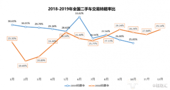 一方面,自去年二手车限迁全面解禁以来,二手车跨区流通趋势加剧。从下图可以看出,2019年的月度转籍比例都高于去年同期(除9、10月外)。