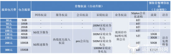 首先,从套餐资源上看,不论是平档还是升档,流量资源均可翻倍,从1倍到6倍不等,最高达150GB流量。130元及以上档次的用户还能领取10GB到150GB不等的流量“加赠”,以及语音(通话分钟数)免费翻番。