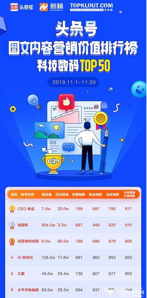 近日,今日头条公布了11月份“头条号图文内容营销价值排行榜”,运营商财经网总榜在日均阅读量方面高达63万,在科技类号中领先。