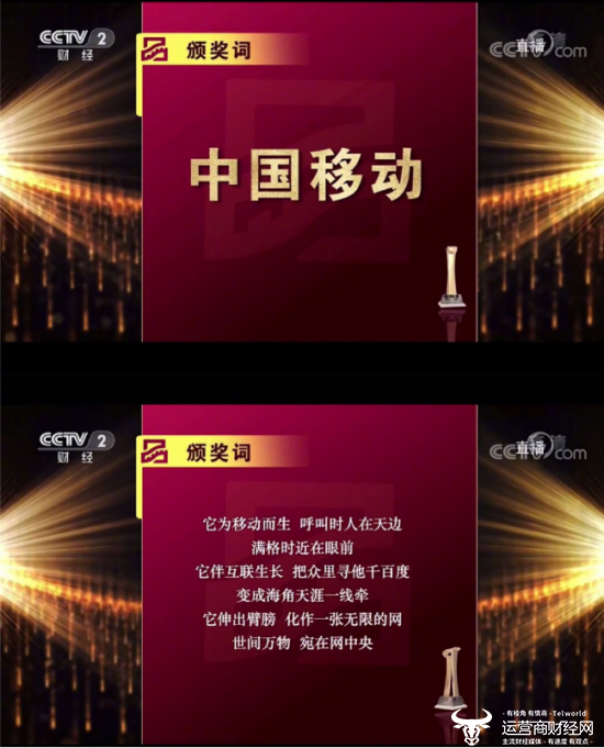 由中央广播电视总台主办的“2019中国品牌强国盛典”活动15日公布首批年度品牌,中国移动荣获“十大年度榜样品牌”称号。颁奖词这样写道:“它为移动而生,呼叫时人在天边,满格时近在眼前;它伴互联生长,把众里寻他千百度,变成海角天涯一线牵;它伸出臂膀,化作一张无限的网,世间万物,宛在网中央。”