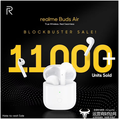 2019年12月20日—中国,北京—新锐智能手机品牌realme日前在印度发布其首款TWS耳机——realme Buds Air,1个小时就售出了11,000台,成功打造印度IoT行业首个爆款。realme Buds Air采用当下流行的耳挂式设计,支持各种无线操作,外观时尚,并配备无线充电仓,以越级实力和颜值,一跃成为印度最受欢迎的TWS耳机。