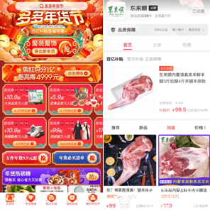 2019年12月20号,拼多多年货节开幕第一天,东来顺羊腿“万人团”狂欢开抢。“百亿补贴”下的东来顺羊腿,售价99.5元,击穿老字号线上零售历史底价;为年货节推出的羊肉“合家欢聚大礼包”,集羔羊切片、上脑、肋排丰富产品,引发抢购。
