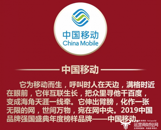 在中央广播电视总台举办的2019年中国品牌强国盛典上,中国移动成功入选“2019十大年度榜样品牌”。该榜单由中央电视台,行业协会权威人士,国家智库成员,经济界、文化界、传播界学者和中央媒体界人士等近百名专家构成的推举委员会评选而出,含金量高,权威性强!