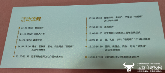 活动流程方面,除了常规的签到致辞颁奖等环节外,最多的是2019年度相关榜单的发布,其中包括通信、互联网、家电、房产、汽车、乳业、医疗等数十个榜单的发布,涉及领域广而全。