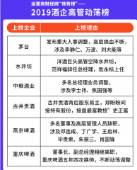 比如“2019酒企高管落马榜”中,五粮液因熊仕霖、郑彬、余铭书、潘钟等人违纪被查处等,被列入榜单之中;同时,违规被查人数高达8位的茅台也在该榜单中被点名。茅台、水井坊、古井贡酒、中粮酒业等企业因高层变动较大而登上了“2019酒企高管动荡榜”。