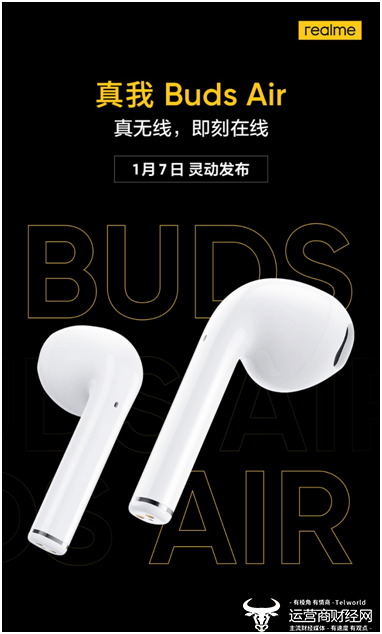 2019年12月27日—中国,北京—新锐智能手机品牌realme真我今日宣布,旗下首款TWS真无线耳机——realme真我Buds Air,将伴随realme真我X50一起,于2020年1月7日举办的5G新品发布会上正式发布。realme真我Buds Air采用当下流行的耳挂式设计,外观时尚,以越级实力和颜值,在海外市场受到了消费者热烈欢迎,此次国内发布必然会再掀高潮。