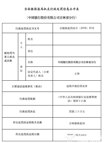 据银保监会今日发布的吉林银保监局机关行政处罚信息公开表显示,中国银行股份有限公司吉林省分行存在违规开展信贷业务违法违规行为,吉林银保监局对其罚款三十万元。行政处罚依据为《中华人民共和国银行业监督管理法》第四十六条。