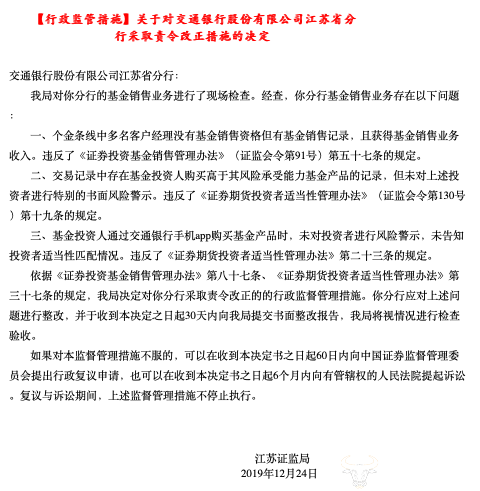近日,运营商财经网从江苏证监局处了解其披露对交通银行股份有限公司江苏省分行采取责令改正措施的决定。经查,该交通银行江苏省分行基金销售业务存在多项问题。