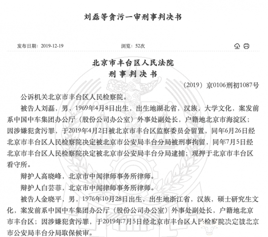 判决书披露,中国中车办公厅外事处副处长刘磊,因涉嫌犯贪污罪,于2019年4月2日被北京市丰台区监察委员会留置,6月26日被北京市公安局丰台分局被刑事拘留,7月5日被逮捕;中国中车办公厅外事处另一位副处长金晓平和外事处工作人员高婧于2019年7月5日被北京市公安局丰台分局取保候审。