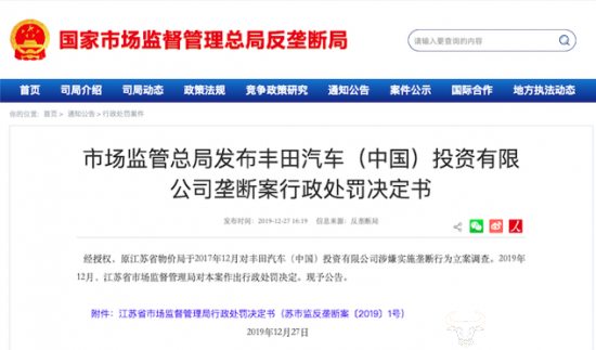 12月27日晚间,国家市场监管总局对丰田汽车(中国)投资有限公司发出一份处罚决定,因其在雷克萨斯品牌汽车销售中违反《反垄断法》,涉嫌实施价格垄断行为,处以8761.3万元罚款。