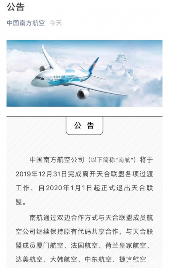 昨日下午,中国南方航空官方微信平台发布公告称将于2019年12月31日完成离开天合联盟各项过渡工作,自2020年1月1日起正式退出天合联盟。