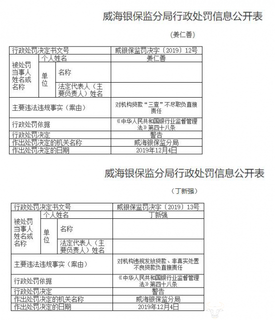 而此次受罚涉及到的相关责任人丁新强为山东威海农村商业银行原董事长;孙庆民为山东威海农村商业银行董事兼总经理;丛剑锋、许福涛为山东威海农村商业银行董事。