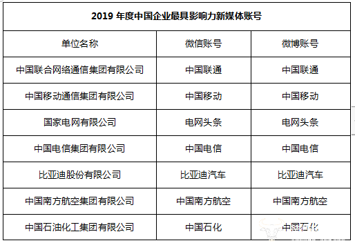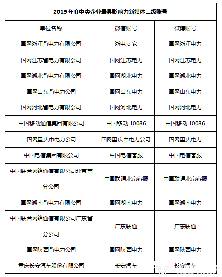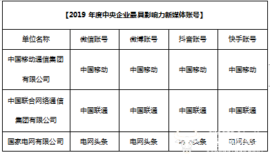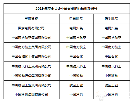 为了更好地帮助中国企业新媒体发展对标,根据大数据建模分析结果,在2019年第七届中国企业新媒体年会上,国资委新闻中心、清博大数据、清华大学新闻研究中心联合发布了2019年中国企业新媒体系列榜单——“2019年度中国企业最具影响力新媒体账号”“2019年度中央企业最具影响力新媒体账号”“2019年度中央企业最具影响力新媒体二级账号”“2019年度中央企业最具影响力短视频账号”。