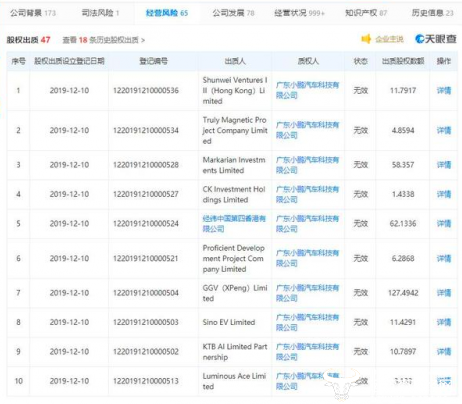 数据显示,小鹏汽车运营主体“广州橙行智动汽车科技有限公司”的47位股东,将所持全部股权悉数出质,质权人均为广东小鹏汽车科技有限公司。