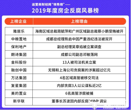 2019年度房地产企业内部反腐是绕不开的话题,运营商财经网搜集整理了今年以来房地产企业反腐情况,推出了“2019年度房企反腐风暴榜”。