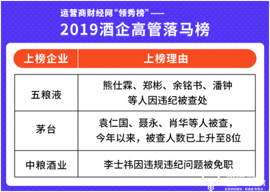 针对2019年酒业重大事件,运营商财经网推出了“2019酒企高管落马榜”,盘点酒企高管违规违纪事件,为人熟知的茅台、五粮液、中粮酒业上榜。