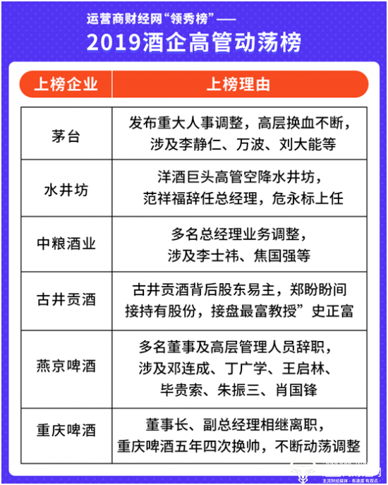 近日,运营商财经网推出“2019酒企高管动荡榜”,盘点这一年比较惹人注目的酒企人事变动。其中,茅台、水井坊、中粮酒业、燕京啤酒等均上榜。