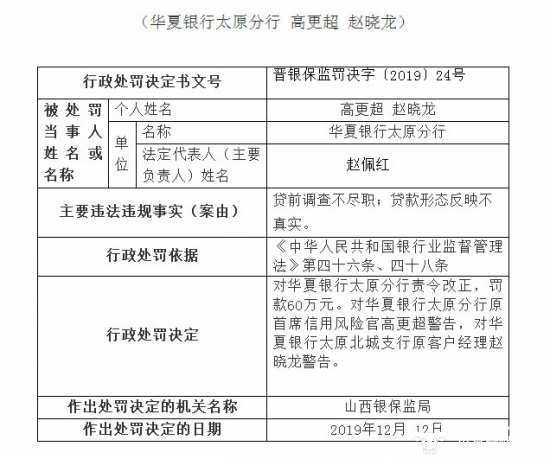 近日,华夏银行太原分行存在贷前调查不尽职;贷款形态反映不真实的违法行为,高更超、赵晓龙对此承担相应责任。
