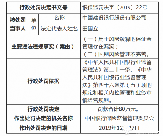 近日,据银保监会网站近日公布的中国银行保险监督管理委员会行政处罚信息公开表显示,中国建设银行股份有限公司因为“用于风险缓释的保证金管理存在漏洞、国别风险管理不完善”两宗违法违规行为,合计被罚款80万,不知中国建设银行董事长田国立、行长刘桂平知晓后是否感到尴尬?