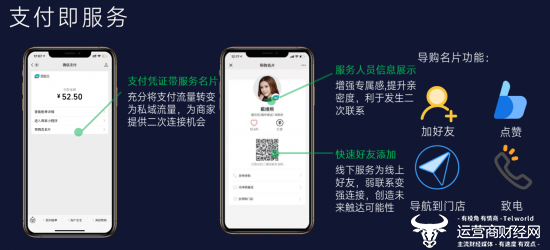 其中,“商家券”结合商家自有体系优惠与微信支付券标准,商家能自主控制核销,场景应用将更丰富;“会员支付组件”则能通过支付前的会员拉新与促活、消费后的开卡有礼与发券,帮助商家提升会员复购并完成数据沉淀;全新上线的“支付即服务”功能,将在用户的支付凭证上增加导购卡片,可将支付流量转化为商家的私域流量,创造二次连接的机会。