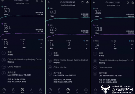 为了更直观体现5G网络的超高速率,测试的第三站我们选取了人口更为集中的商业办公区域。在金融街购物中心附近,中国移动5G下载速度最高可达570 Mbps、上传速度最高可达58.4 Mbps,而最低下载速度也能维持在344 Mbps。