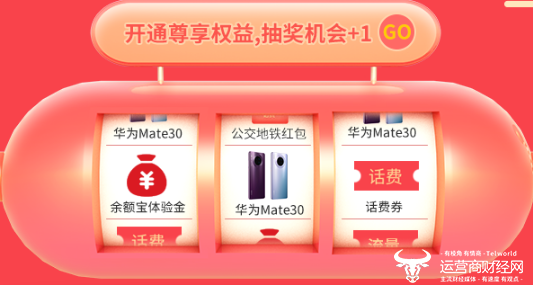除了三重好礼外,中国移动-支付宝双V会员基础权益用户还可以参加“福气锦鲤”抽奖活动,奖品池不仅有华为Mate30 5G手机这样的“锦鲤大奖”,也有饿了么红包、1到3元不等的流量券、天猫超市商品券、淘宝心选5元券、口碑红包、淘票票优惠券,以及虾米音乐、优酷视频会员权益等实用奖品。值得一提的是,双V会员尊享权益用户还能额外增加1次抽奖的机会,更有机会抽到锦鲤大奖。
