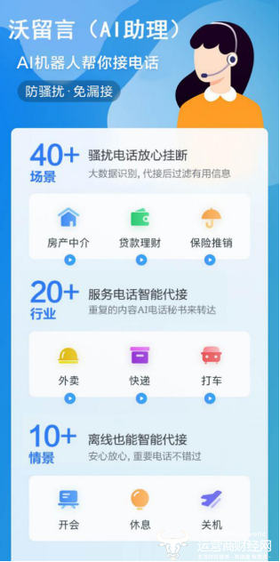 这款产品具有防骚扰电话、来电智能代接听以及离线智能代接听处理等功能。在智能“代接电话”过程中,沃留言产品可自动根据通话内容判断是否为骚扰电话,而采取是否拒接或自行与之对话,可以有效防止用户被房产中介、贷款理财、广告推销等人员的骚扰。