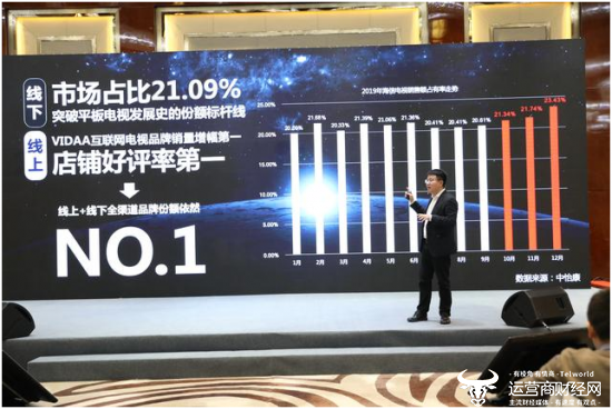 虽然近十几年来,海信电视一直居市场榜首,但2019年,这个第一又被赋予了新的意义。根据中怡康数据,2019年的12个月,海信电视线下销售额占有率全部超过了20%,全年达到21.09%。这是中国平板电视兴起20年来,第一次有品牌超越20%。此外,海信2019年发布的全新互联网电视品牌VIDAA,当年就拿到了互联网电视品牌销量增幅第一和店铺好评率第一。