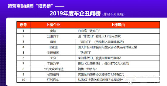 近日,运营商财经网推出“2019年年度车企丑闻榜”榜单,盘点这2019年汽车行业发生的丑闻事件,其中在江淮汽车因“排放门”被处以1.7亿元罚款事件也榜上有名。