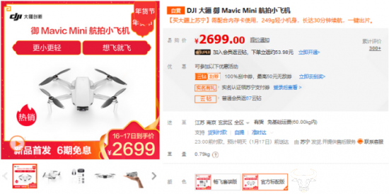 从目前的数据看来,不少人选择春节到国内北方城市体验冰雪游,想要拍一个雪景大片也免不了无人机的支持。苏宁易购官网大疆的一款御 Mavic Mini 航拍小飞机,仅249克的机身,与手机重量相仿,出行极方便携带,对于想要去美国、加拿大等地旅行的消费者来说,该无人机符合大多数国家和地区对微型无人机安全重量的要求,在当地无需登记注册便可使用,很是方便。同时支持4公里高清图传、一键剪辑、稳定悬停等功能,足以满足春节旅游拍摄需求。目前苏宁易购年货节活动价到手仅需2699元,正值新品首发,支持6期免息,很是划算。
