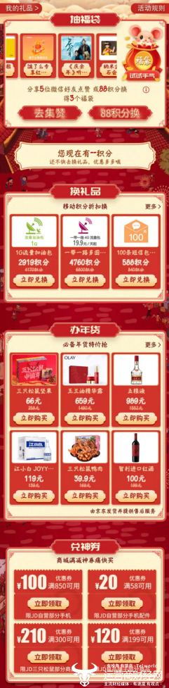 更激动人心的是,点赞完成后就能点击直达中国移动“年货节”主会场,这个由运营商举办的年货节活动别开生面,福利十分接地气,既可以抽福袋赢流量,也可以用移动积分换礼品,享受折扣办年货的特权,还能兑换京东商城大额优惠券,玩法五花八门,福利都是实打实的。
