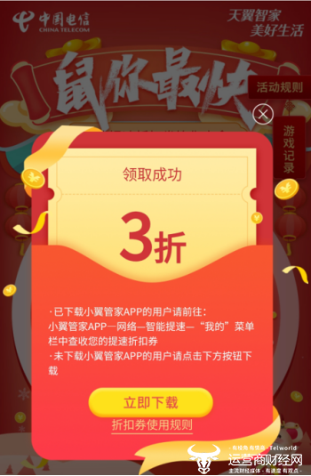 为了解活动真实性,记者亲身体验了该抽奖活动,第一次抽奖就抽中了3折的折扣券,输入手机号后,果真有优惠券入手。同时在活动页面,记者看到中国电信还贴心的给出兑换规则提醒,已经下载小翼管家的用户,可通过“小翼管家-网络-智能提速-我的”菜单栏查收,在购买智能提速产品时兑换。